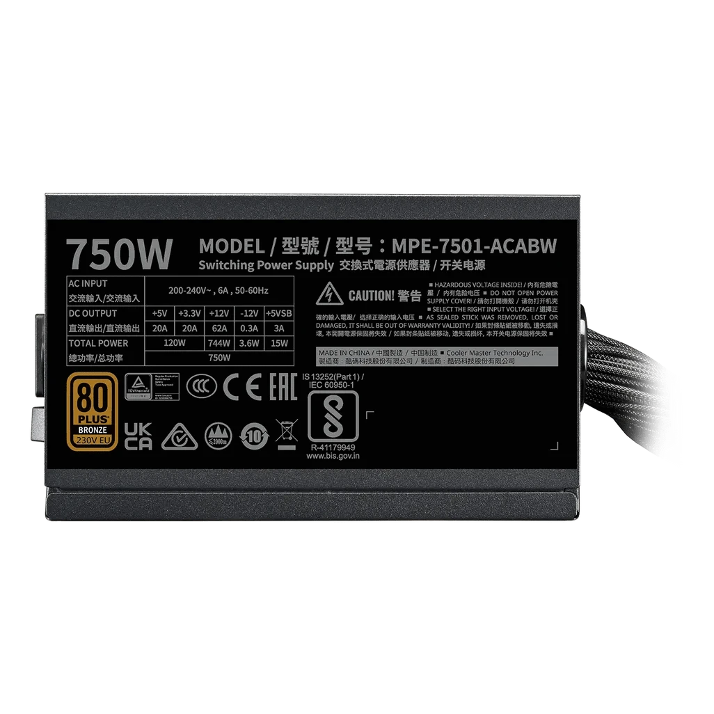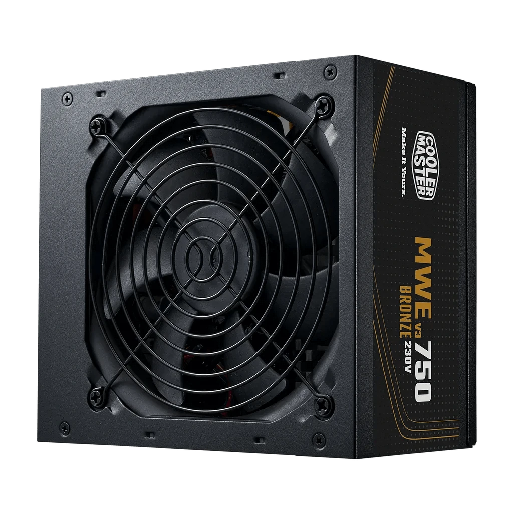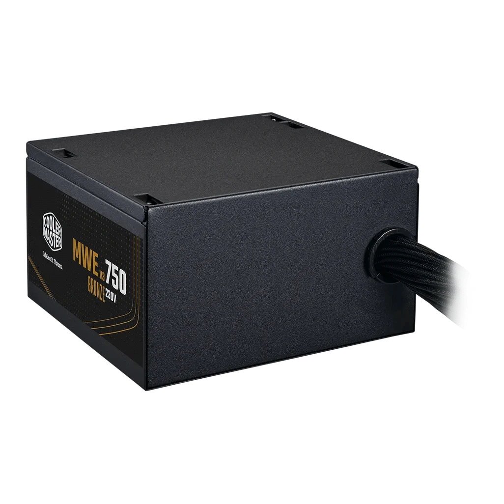 Cooler Master MWE Bronze 750 V3 230V. Total power: 750 W, AC input voltage: 220 - 240 V, AC input frequency: 50/60 Hz. Motherboard power connector: 24-pin ATX, Motherboard power cable length: 50 cm, SATA power cable length: 400,550,700 mm. Purpose: PC, Power supply unit (PSU) form factor: ATX, 80 PLUS certification: 80 PLUS Bronze. Product colour: Black, Cooling type: Active, Fan diameter: 12 cm. Width: 150 mm, Depth: 140 mm, Height: 86 mm