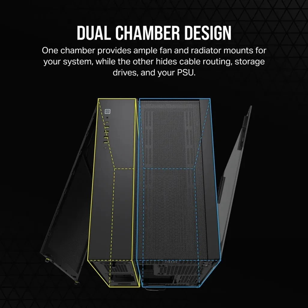 Corsair 6500D AIRFLOW. Form factor: Midi Tower, Type: PC, Product colour: Black. Front radiator sizes supported: 120,140,240,280,360 mm. Width: 328 mm, Depth: 481 mm, Height: 496 mm