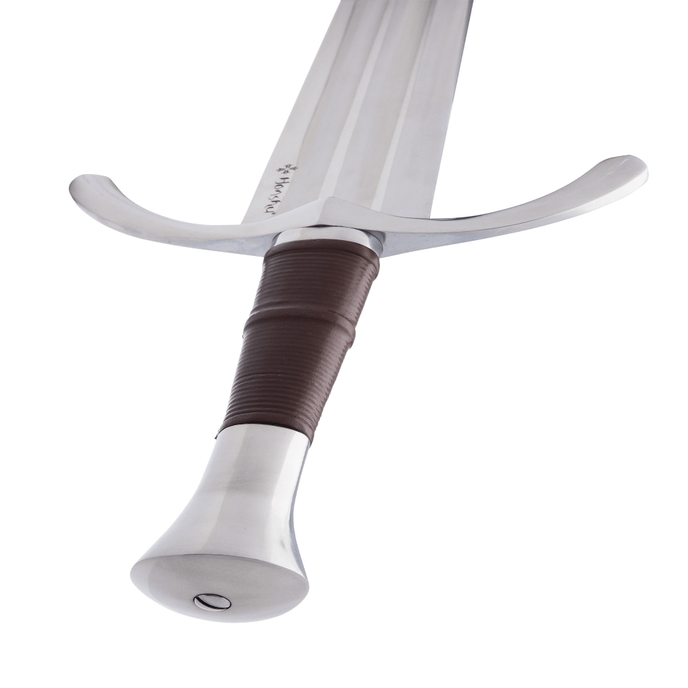 The Honshu Historic Sword boasts an authentic Japanese-style tsuka (handle) wrapped in genuine ray skin and black cotton cord, providing both beauty and a secure grip. The iron tsuba (guard) displays an intricate geometric design, while the lacquered wood scabbard features matching black cord wrappings for a complete, museum-quality presentation. With its razor-sharp edge and historically accurate proportions, this sword delivers both visual impact and functional performance.