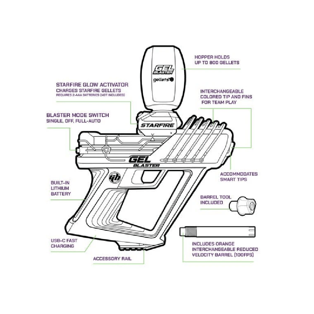 Gel Blaster Starfire blasts eco-friendly, glow in the dark Starfire Gellets which disintegrate on impact, leaving only a glowing trace behind.