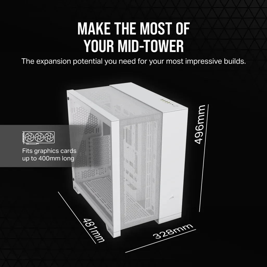 Corsair 6500D AIRFLOW. Form factor: Midi Tower, Type: PC, Product colour: White. Front radiator sizes supported: 120,140,240,280,360 mm. Supported HDD sizes: 2.5,3.5". Width: 328 mm, Depth: 481 mm, Height: 496 mm