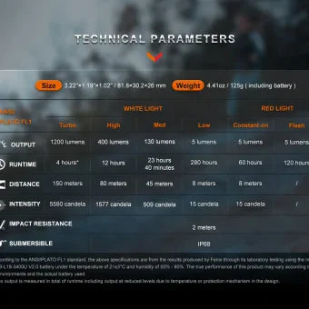 1200 lumens maximum output and 150 meters maximum beam distance.