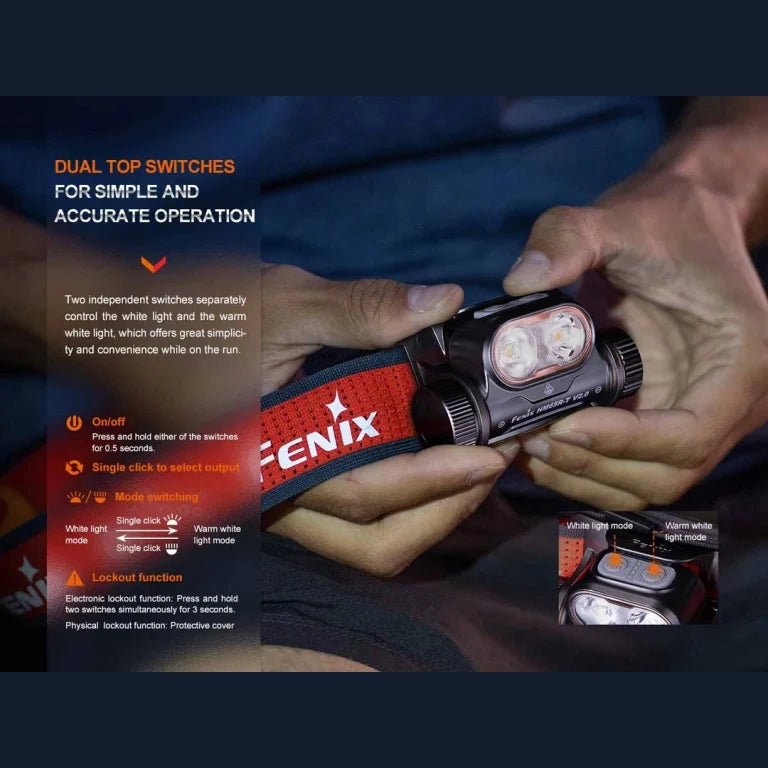The Fenix HM65R-T V2.0 Rechargeable Headlamp has been upgraded to be the most comfortable hands-free lighting tool on the market. The new SPORT fit headband is larger, has an improved rotary adjustment dial for more precise control, and includes a built-in emergency whistle. Rather than a spotlight and floodlight, the HM65RT V2.0 has one a cool white light and one warm light. Choose warm light for better penetrating performance in foggy conditions. USBC rechargeable with a battery level indicator, this headlamp can run for up to 300 hours continuously on its lowest setting. Great for trail runners, on the job, or just for everyday hands-free lighting needs, the Fenix HM65R-T V2.0 Headlamp is the perfect fit.