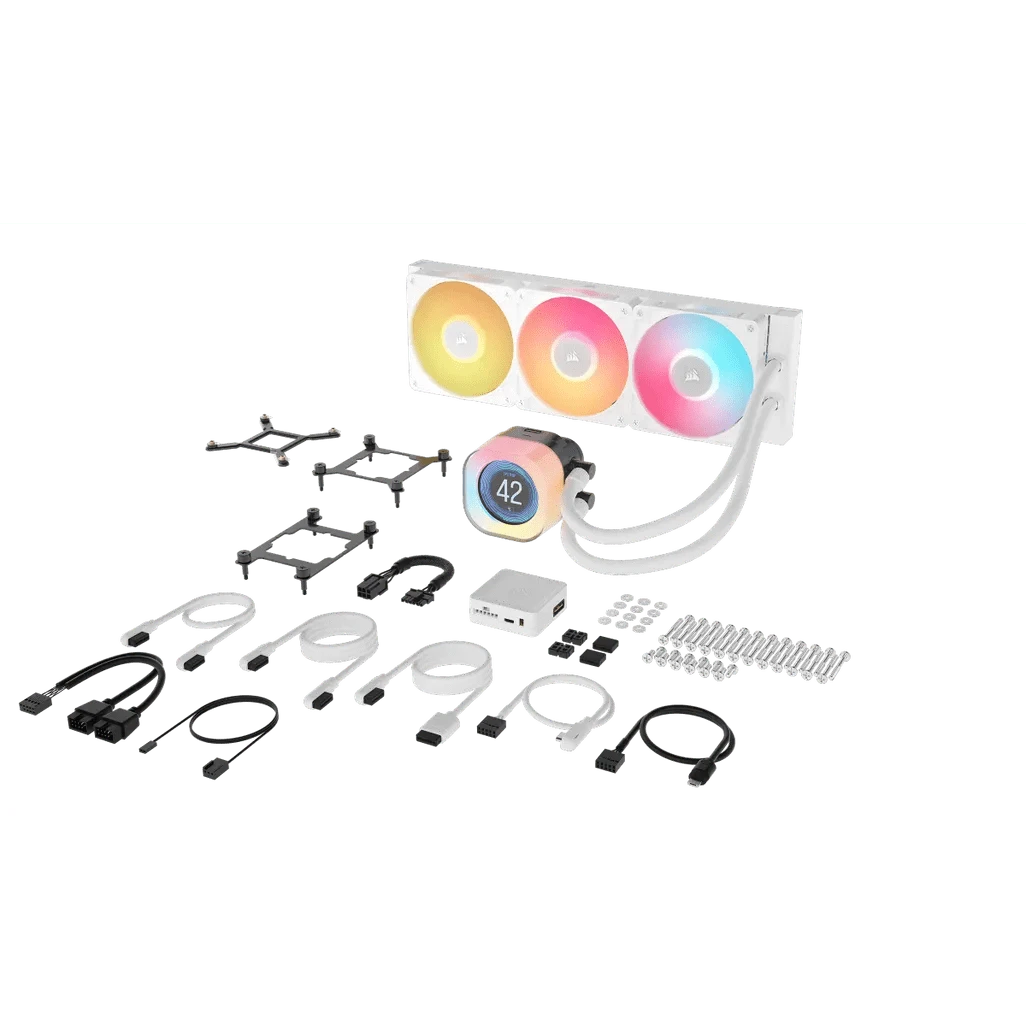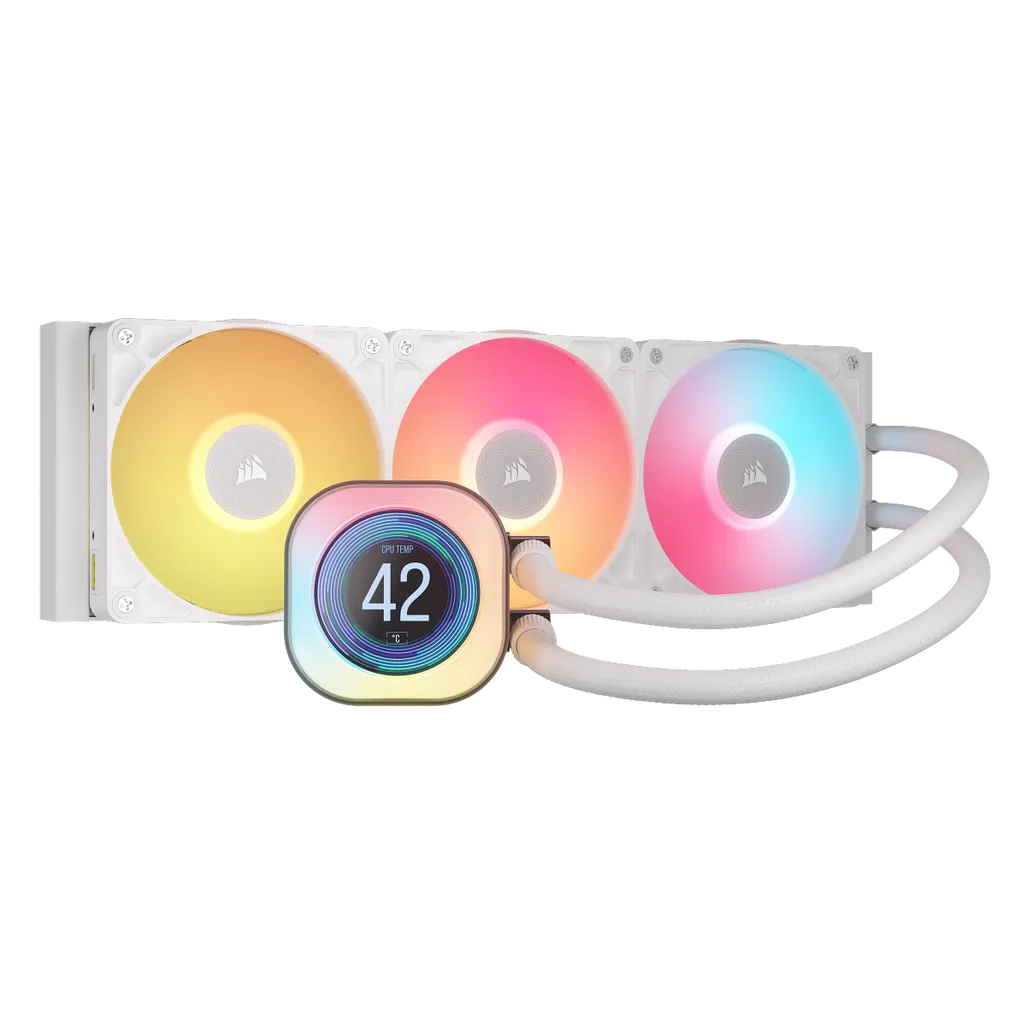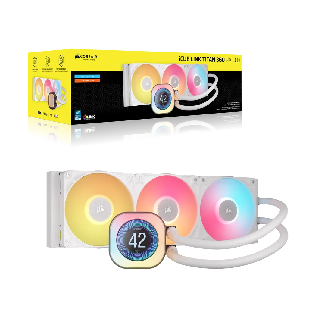 Corsair iCUE LINK TITAN 240 RX LCD. Type: Air cooler, Fan diameter: 12 cm, Rotational speed (min): 300 RPM, Rotational speed (max): 2100 RPM, Noise level (low speed): 10 dB, Noise level (high speed): 36 dB, Maximum airflow: 73.5 cfm. Width: 125 mm, Depth: 125 mm, Height: 275 mm. Product colour: White