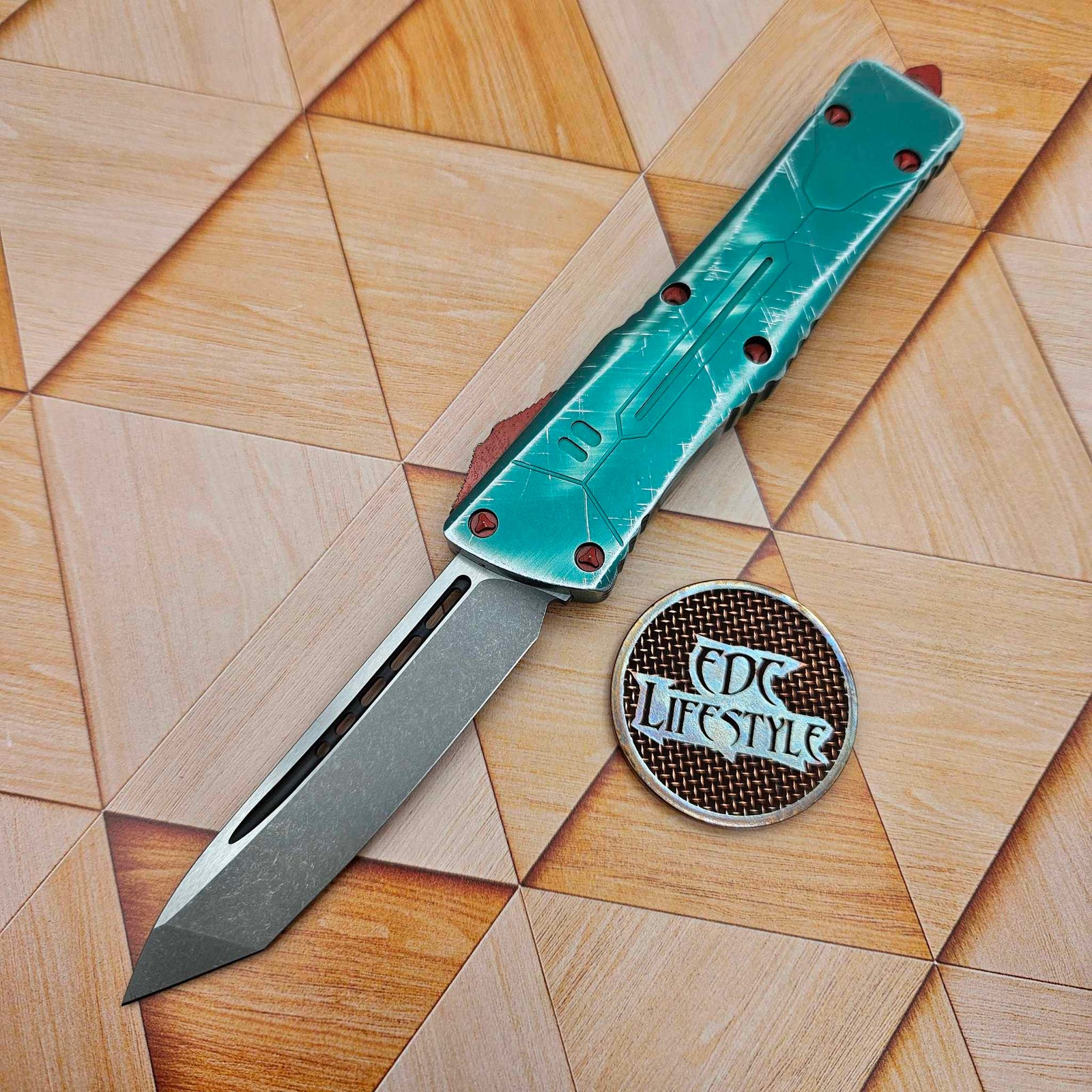 The Microtech 144-10BH Bounty Hunter Green Apocalyptic Combat Troodon is a high-performance out-the-front (OTF) knife built for tactical and utility applications. Designed to be 25% larger than the original Troodon, this knife features a contoured handle for a secure grip and an efficient dual-action mechanism for rapid deployment and retraction. The rugged green apocalyptic anodized finish, inspired by the legendary Bounty Hunter theme, gives it a battle-worn look that stands out while maintaining durability.