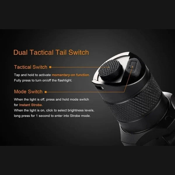 The Fenix TK16 flashlight delivers functionality and performance, authorizing it as a reliable and necessary tool for emergency and tactical applications. This LED light is the first to feature Fenix’s new Dual Tactical Tail Switch for one-finger operation including instant access to strobe and momentary functions. Compact body design with one inch body width and slightly larger head is perfect design for current duty belts in Law Enforcement, Security, Industrial and Commercial applications.