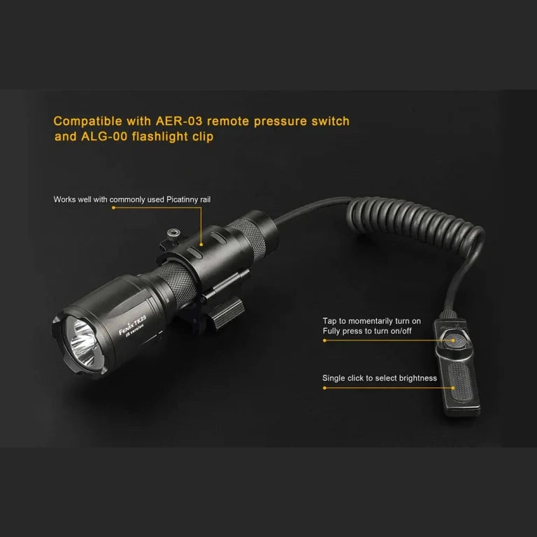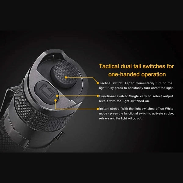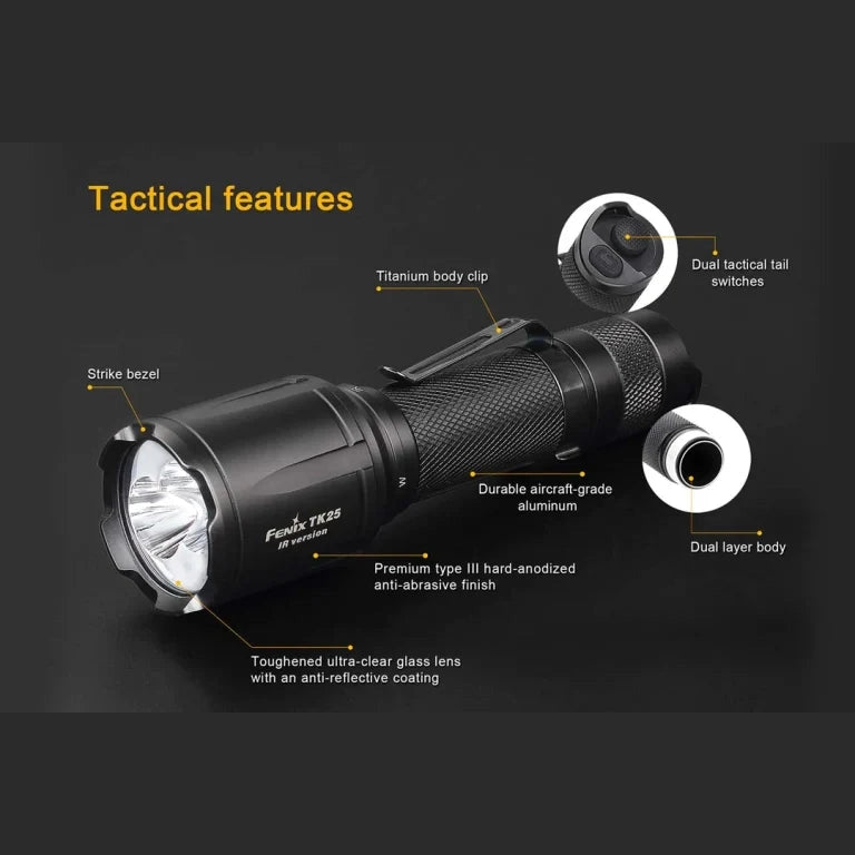 The patented switching mechanism makes the TK25IR easily switched into either flashlight mode or IR mode with no questions of which is activated. Additional features of the flashlight include 4 lighting modes and strobe function, dual layer body for additional impact resistance, IP68 waterproof/dust proof, and tactical tail switch. A full range of gun mounting accessories are also available separately for this device.