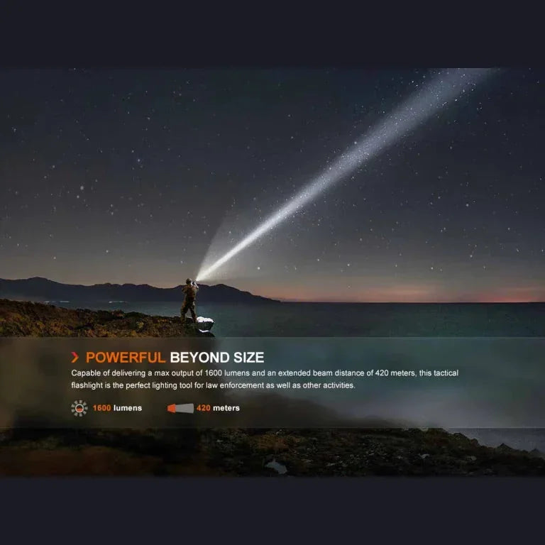 The Fenix TK11R Rechargeable Tactical Flashlight delivers a powerful 1600-lumen beam that reaches 1378 feet (420m). Dual tail switches provide quick and easy access to three brightness levels and a strobe mode. This flashlight is powered by an included single 18650 Li-ion battery, or two CR123A batteries can be used as a backup power source. Check on the battery’s status with the battery level indicator and recharge the light via the USB Type-C port. Impact-resistant and IP68-rated dust/waterproof round out the features that make the TK11R an affordable tactical performer.