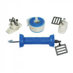 The kit features an insulated handle with a spring mechanism, ensuring safe operation when opening and closing the gate. The included buckles facilitate quick and secure attachment of the poly tape to the gate handle, allowing for easy setup and maintenance. Whether you need to create a temporary or permanent access point, the Nemtek Agri Gate Handle Kit offers durability and convenience for your electric fencing needs.
