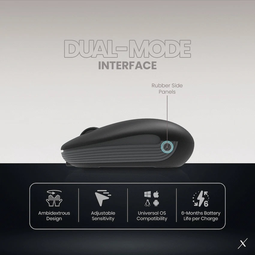 Meet the VolkanoX Asher Bluetooth Wireless Mouse - a stylish, powerful companion for your workspace or travel bag. With both Bluetooth and 2.4?GHz USB receiver connectivity, it pairs easily with laptops, tablets or desktops. Whether you're navigating spreadsheets, editing photos, or browsing, its adjustable sensitivity (up to 4800 DPI) gives precise control that adapts to your pace.Thanks to its dual 600?mAh rechargeable battery system, you get up to 6 months of use on a single charge between top?ups. Soft, silent click buttons and a premium build with rubber side panels make it comfortable for long sessions. It's designed to fit both left and right hands (ambidextrous), and given its universal OS compatibility and sleek design, it's made to be used well and used often.