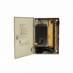 The durable lockable metal enclosure ensures a secure installation, suitable for both commercial and industrial security environments where reliability and protection are critical. Its design makes it an excellent choice for large-scale CCTV deployments requiring centralized power distribution.
