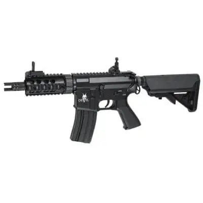 Take your airsoft game to the next level with the ASG Devil M15 Compact 5 Airsoft Gun, designed for those who demand both power and precision in their gameplay. Ideal for close-quarters combat and clearing houses, this high-performance airsoft rifle features an aggressive rebar cutter flash suppressor, a quad rail front-end for tactical customization, and a collapsible 7-position stock for personalized comfort and maneuverability. With a metal piston head, 8mm bearings, and a quick-change spring guide for easy access to internal components, this gun ensures reliable performance during every match.