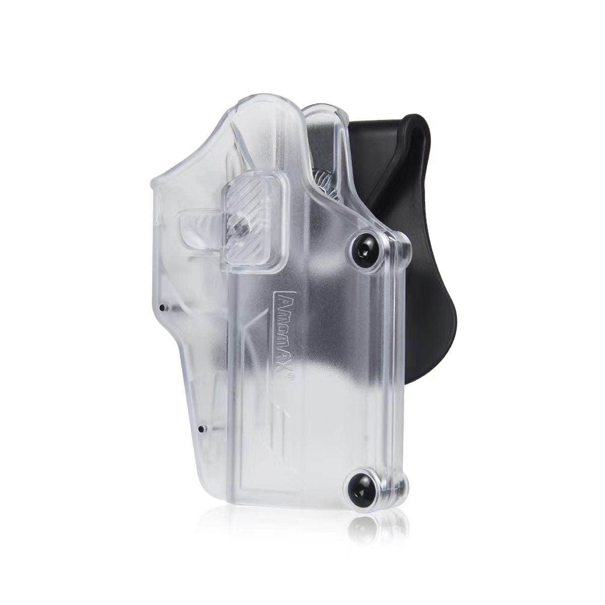 The Amomax Q.R. Universal Polymer Paddle Holster is the ideal solution for firearm owners seeking comfort, security, and accessibility. Designed for over 80 pistol models, including Glock, Sig, CZ, Ruger, and many more, this versatile holster offers a universal fit and can adapt to a wide range of firearms. The quick-release button system allows for effortless drawing of your weapon, while the secure locking system ensures your firearm stays in place until you need it. The holster also features a knurled adjustment point that lets you change the cant angle of your holster in 9-degree increments, providing a customized fit for your drawing preference.
