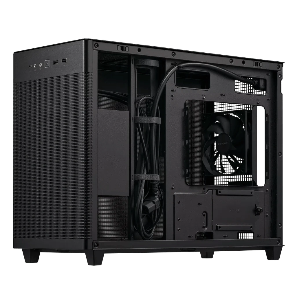 ASUS AP201 PRIME CASE TG. Form factor: Mini Tower, Type: PC, Product colour: Black. Rear fans installed: 1x 120 mm, Rear fans diameters supported: 120 mm, Top fans diameters supported: 120,140 mm. Supported HDD sizes: 2.5,3.5". Width: 205 mm, Depth: 350 mm, Height: 460 mm