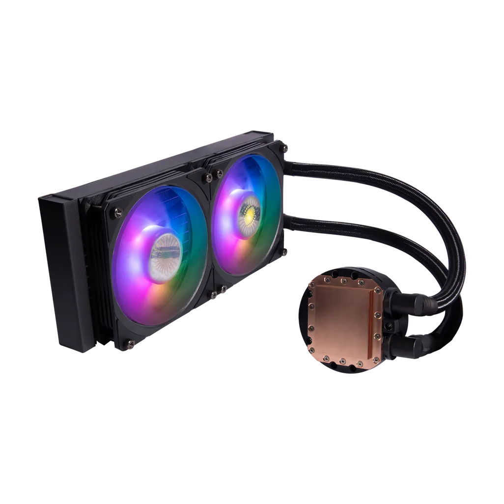 Cooler Master MasterLiquid PL240 Flux. Type: Liquid cooling kit, Fan diameter: 12 cm, Rotational speed (max): 2300 RPM, Noise level (high speed): 32 dB, Maximum airflow: 72.37 cfm, Maximum air pressure: 2.96 mmH2O. Product colour: Black