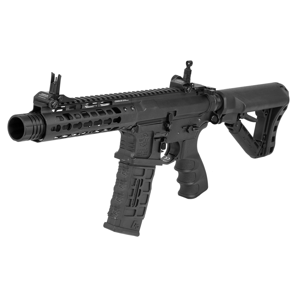 Ambidextrous controls, such as the magazine release and mock charging handle, ensure that both left- and right-handed players can operate seamlessly. The ergonomic motor grip and GOS V3 retractable stock add comfort and control, while flip-up front and rear sights enhance target acquisition.