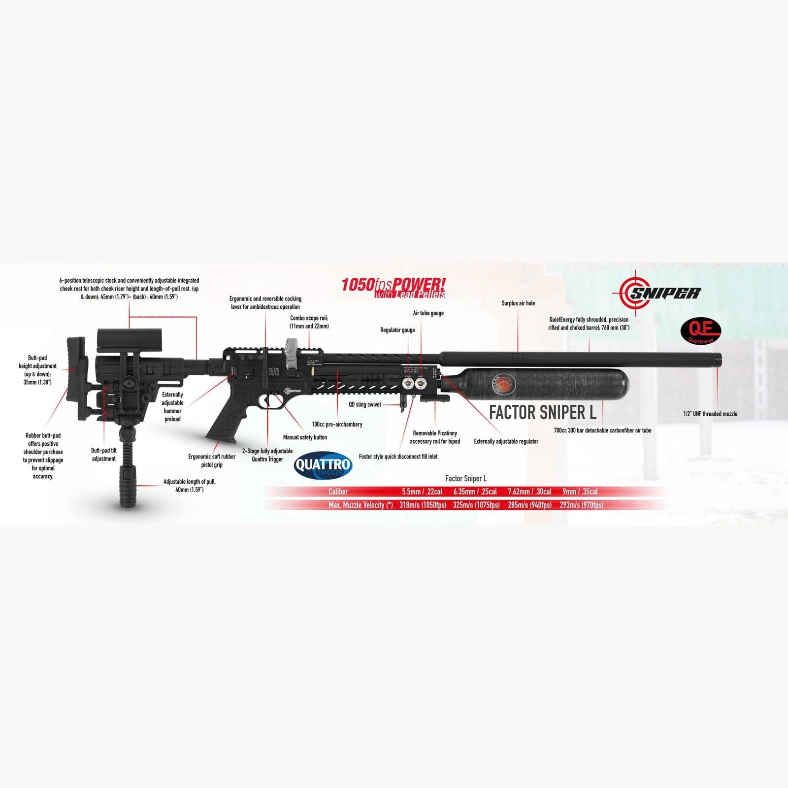 The Hatsan Air Rifle Factor Sniper-L 5.5mm is a precision-engineered, pre-charged pneumatic (PCP) air rifle designed for serious shooters. Featuring a pressure-adjustable regulator and a carbon fiber air bottle version, this model ensures both performance and durability. Ideal for hunters and target shooters, it offers exceptional accuracy and power, with a 21-shot magazine in 5.5mm. The rifle's design includes a fully shrouded barrel with an integrated sound moderator that reduces noise by approximately 50%, making it a quieter option in the field. Whether you're a seasoned airgun enthusiast or new to the sport, the Factor Sniper-L provides an impressive combination of power, precision, and ease of use.