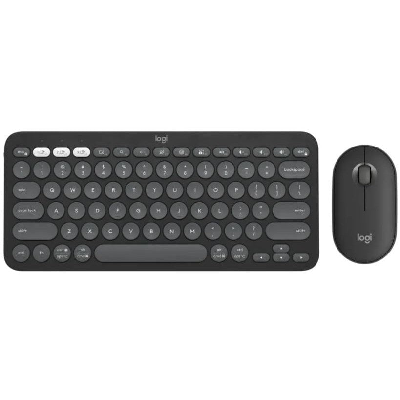 Logitech Pebble 2 Keyboard & Mouse Combo - Black, Slim, lightweight keyboard and mouse combo, made with over 45% recycled plastic, Bluetooth Low Energy and Logi Bolt USB receiver connectivity, Multi-device pairing (up to 3 devices), Silent Touch Technology for quiet clicks and typing, Customizable middle mouse button and 10 Fn shortcut keys via Logi Options+ app, High-precision optical sensor (400-4000 dpi adjustable), Wireless range 10m, Keyboard battery: 2x AAA, Mouse battery: 1x AA, On/off power switches, Battery LED indicator, Compatible with Windows and macOS, Compact and portable design