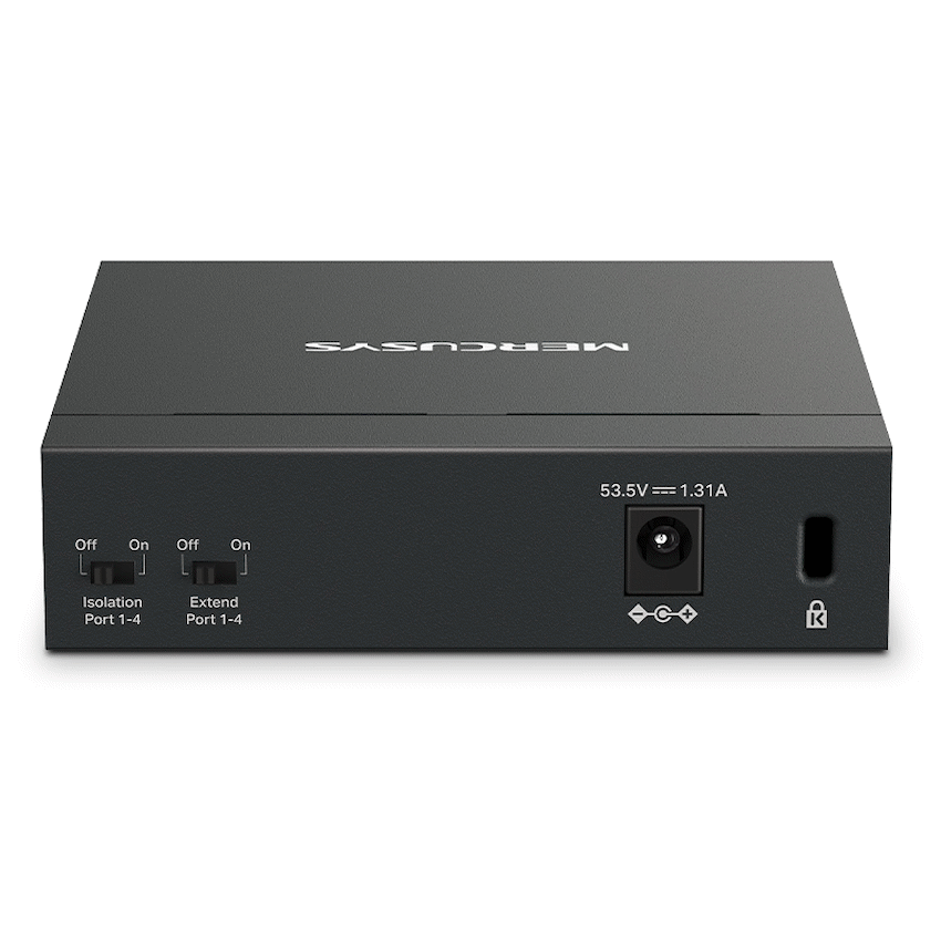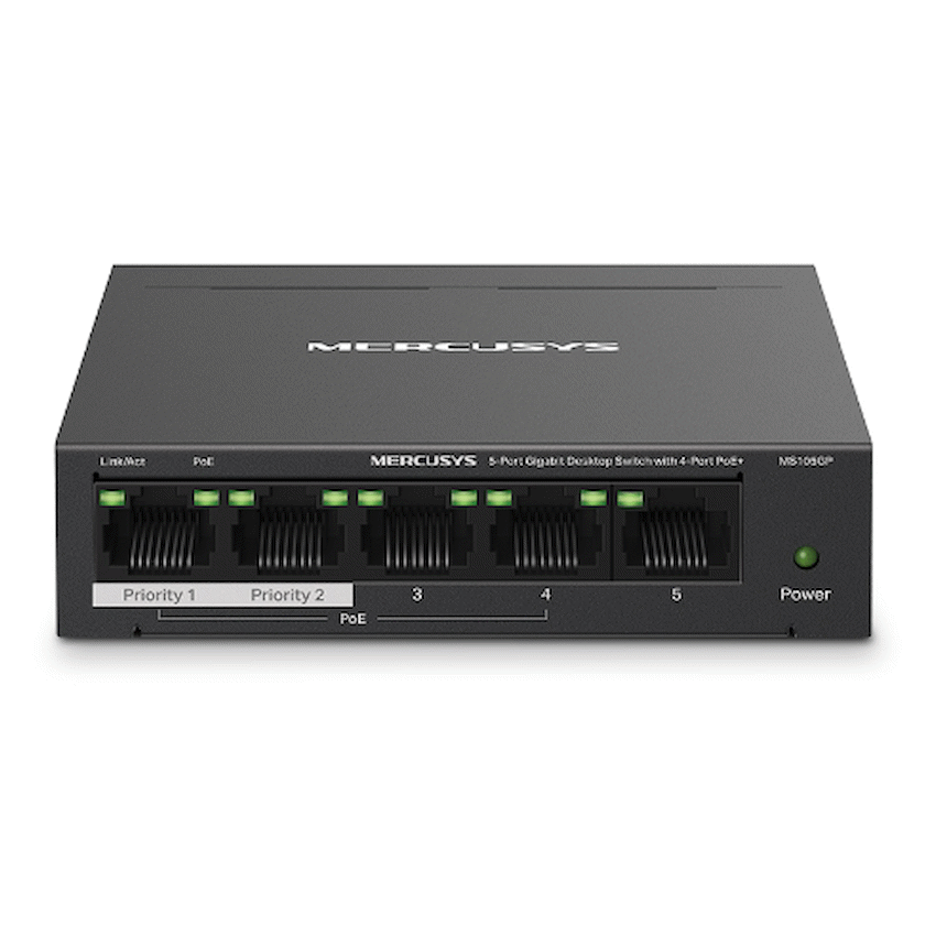 Mercusys MS105GP 5-Port Gigabit Desktop Switch with 4-Port PoE+ – 5GB RJ45 ports, with four PoE+ ports supporting up to 30W each and a total power budget of 65W. Supports data rates up to 2000 Mbps full duplex, jumbo frames up to 9 KB, and has a MAC address table of 2,000 entries. Durable metal case, plug and play operation, and options for desktop or wall mounting. Dimensions 99.8 x 98 x 25 mm. Operating temperature 0–40°C, humidity 10–90% RH non-condensing. Package includes power adapter and quick installation guide, Retail Box, 2 year Limited Warranty