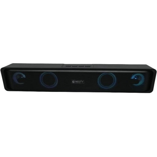 Nesty 2 Channel Stereo RGB LED Lightning Mini SoundBar - Power Rating Output 2x 5w, Bluetooth Ver 5.0, FM Radio, USB 2.0 Playback Input Port, MicroSD Playback Input Slot, Audio Input 3.5mm Jack, Supports True Wireless Pairing , Rated Voltage 3.7V , Frequency Response 90Hz-160kHz, Micro USB Charging Port, Built-in Rechargeable 1200mAh Battery , Battery Playback Time Up to 1- 2.5 Hours, Charge Input DC 5V, 1A, Charging Time Up To 2 Hours, RGB LED Lightning, Compatible With Desktop PC’s , Laptops And Televisions, Colour Black , Retail Box, 6 Months Warranty