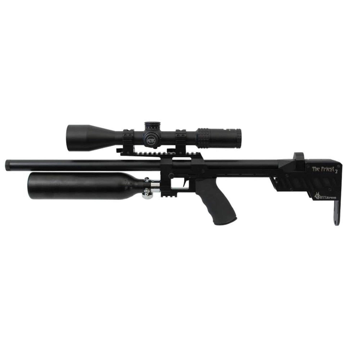 Featuring a powerful 320cc buddy bottle, the Priest II offers up to 100 shots per fill with a consistent 45J energy output in caliber 5.5 (.22). Its specially designed system ensures no hammer bounce, achieving perfect valve closing for increased efficiency. The rifle is equipped with a 20 MOA angled Picatinny rail for enhanced accuracy during long-range shots. Optional accessories, including a Plenum Extension and externally adjustable pressure regulator, allow shooters to further customize the rifle to their preferences. The Priest II also offers versatility with caliber kits and additional barrel options.
