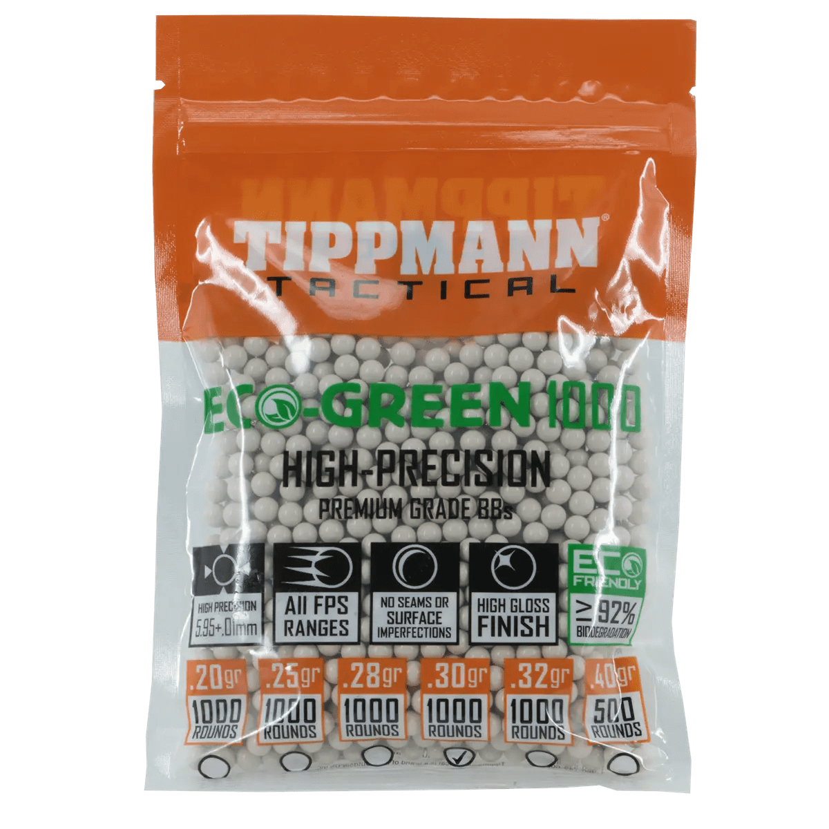 Designed with sustainability in mind, TIPPMANN 6MM ECO BBS are biodegradable and break down into natural compounds over time, reducing their ecological footprint. While they are environmentally friendly, they still maintain top-tier performance. The uniform size and weight distribution ensure each BB flies straight and hits its target with precision. The 30-gram weight makes them compatible with a wide range of airsoft guns, offering versatility across various setups. With TIPPMANN 6MM ECO BBS, you get the reliability you need, while helping protect the planet.