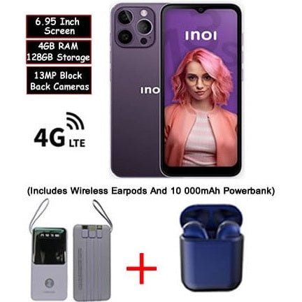 INOI Note 13s 128GB Storage and 4GB Ram Android Smart Phone - Nano Sim Slot, IPS 6.95 Inch Display, High Definition Plus Resolution 720 x 1600 Pixels, Screen Ratio 20:9 , 4G and LTE, Cortex A7 Octa Core Processor, Total 13 Mega Pixel Triple Block Back Cameras, 8 Mega Pixel Front Camera, Face Unlock Feature, 5000mAh Lithium Battery, Type-C USB Charging Port, MicroSD Slot for Additional Storage , Wifi 802.11AC/b/g/n , GPS and A-GPS, Glonass, Includes Clear Silicon Cover and Type Charger Cable, Wireless Earponds And 10 000mAh Powerbank, Android OS Ver13, Colour Deep Purple and 1 year warranty carry-in.