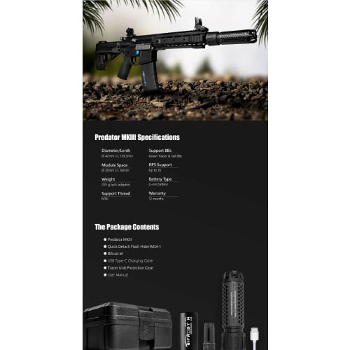 At 139.3 mm long and 42 mm diameter, the Predator MKIII is compact enough for close-quarters setups yet long enough to provide a convincing suppressor profile. The Bifrost M module is rechargeable (USB-C) and uses an internal Li-ion cell, giving you easy recharges between games. Swapable tracer modules also let you upgrade or change color profiles in the future.