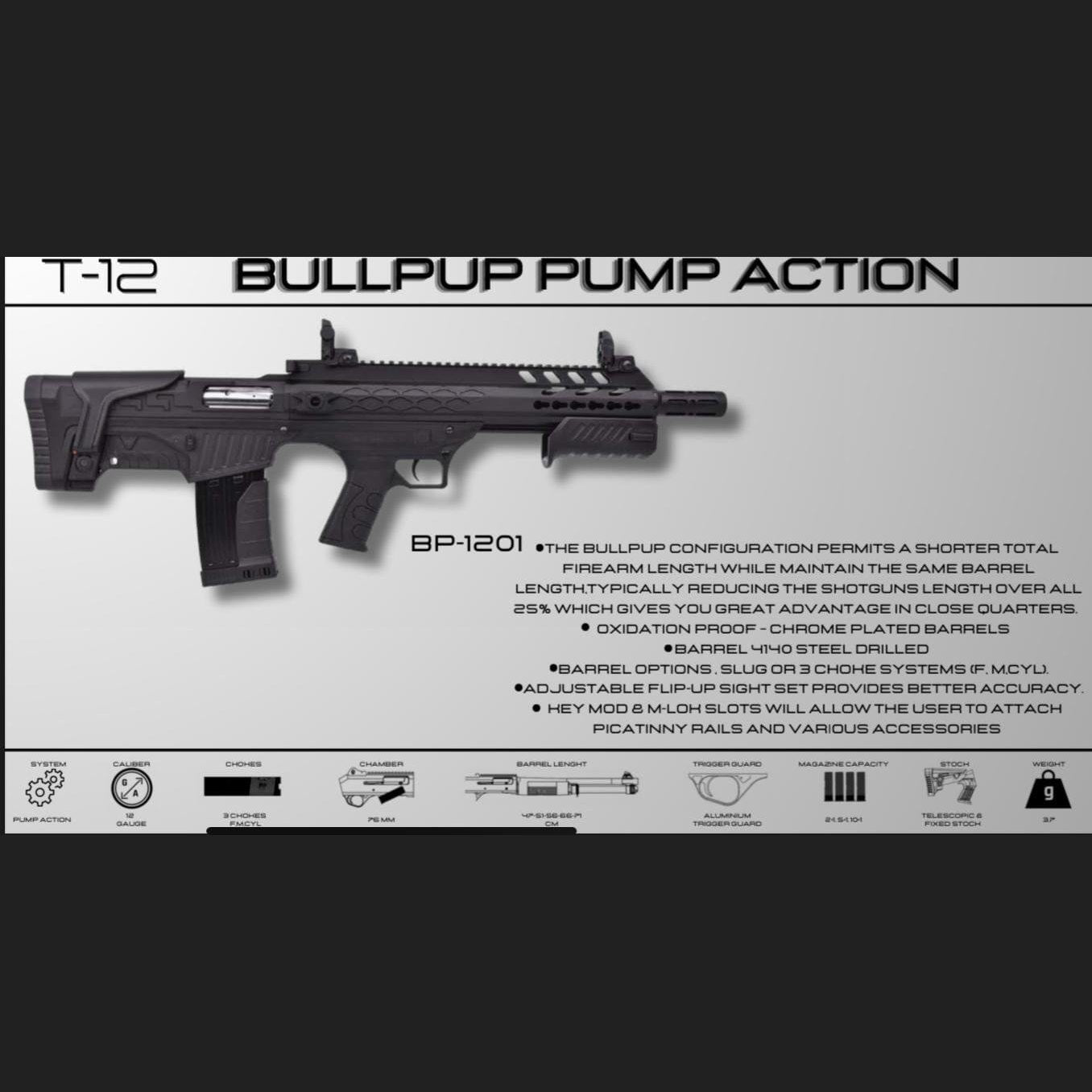 The Aksa Arms T12 Bullpup 12-Gauge shotgun is a versatile and compact firearm designed to meet the needs of hunters, sport shooters, and home defense enthusiasts alike. Its innovative bullpup design places the action and magazine behind the trigger, significantly reducing overall length without compromising barrel length or performance. This makes it an excellent choice for close-quarters use, where maneuverability and space-saving are paramount. The T12 features a durable synthetic stock and ergonomic design, providing a comfortable grip and excellent balance. Its 12-gauge chamber accommodates a wide range of ammunition, from birdshot to slugs, offering adaptability for various shooting scenarios.