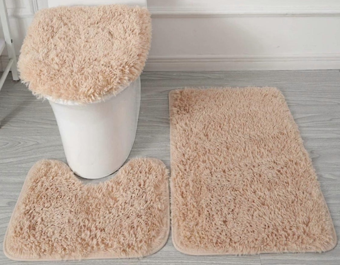 Casey Bathroom Biscuit 3-Piece Non-Slip Mat Set Superfine fluffy polyester fibers offer enhanced absorbency, strong water imbibition, and dust collection for dry floors, with earth-cold insulation and non-slip backing. Includes U-shaped plush mat (38x40cm), toilet lid cover (40x50cm), and large floor mat (40x80cm) for complete bathroom coverage and serene comfort. Easy care: Wash with neutral detergent, no bleach/softener; twist dry and air-dry naturally for lasting plush performance.