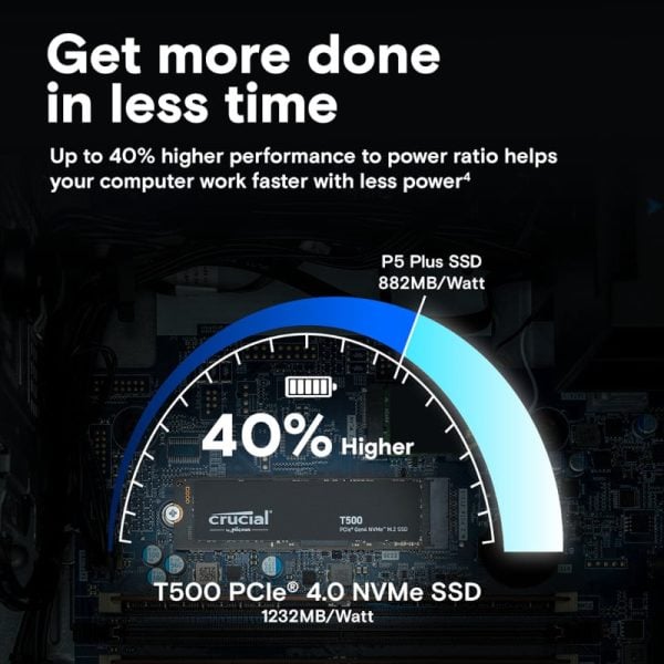 Experience a 40% increase in performance-to-power ratio, allowing your computer to work faster while using less power. With the Crucial T500 SSD, you can easily upgrade your system and enjoy the benefits of lightning-fast performance.