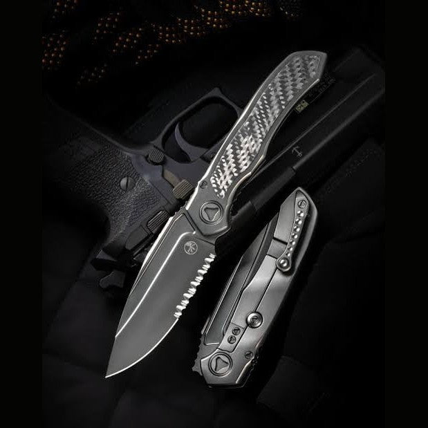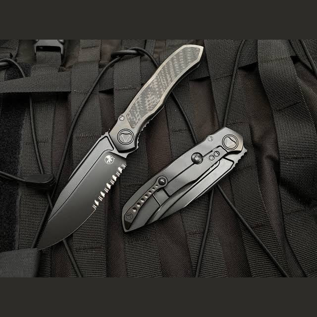 The Anax’s solid titanium handle features a carbon fiber inlay, enhancing both the knife’s visual appeal and lightweight durability. With its smooth ball-bearing pivot, robust frame lock, and premium materials, this knife is built for longevity and top-tier performance. Every detail, from the ceramic ball pocket clip to the removable wire lanyards, reflects Microtech’s commitment to quality and innovation.