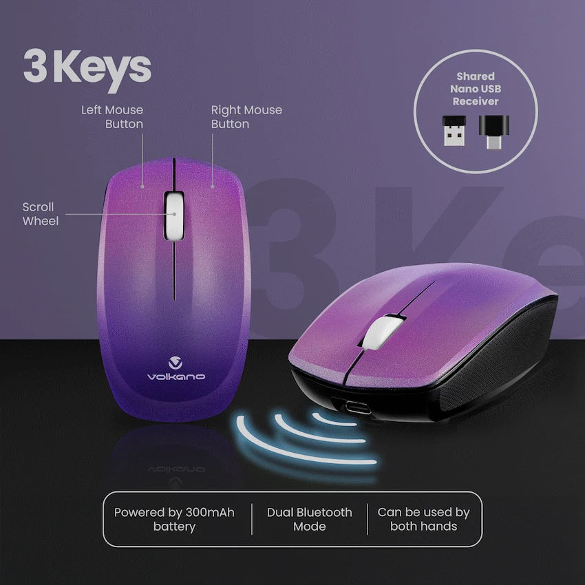 Work smarter and in style with the Volkano Prism Series Wireless Keyboard & Mouse Combo, designed for effortless everyday computing. Featuring Bluetooth + 2.4GHz dual-mode connection, this combo gives you the flexibility to connect to a wide range of devices-whether it's a laptop, tablet, desktop, or smartphone. With universal OS compatibility, it's ready to pair with Windows, macOS, Android, and more.The keyboard delivers a comfortable, quiet typing experience thanks to silent soft touch keys in a slim, modern layout. The ergonomic mouse ensures responsive control with a 1200 DPI sensor, and both the keyboard and mouse are USB-C rechargeable, so you can say goodbye to replacing batteries. A generous 10m wireless range gives you the freedom to work or play from a distance-without lag or dropouts.Whether you're at the office, in a study space, or on the move, this combo keeps you connected, productive, and clutter-free.