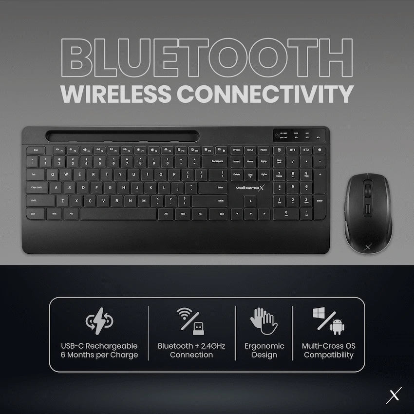 Upgrade your workspace with the VolkanoX Gem Series Bluetooth Wireless Keyboard & Mouse Combo. This sleek combo delivers what you want in a modern setup: multimode connection (Bluetooth + 2.4?GHz wireless), rechargeable power, silent typing and clicking, and soft backlit keys for low?light comfort. Whether it's work, study, or creative play-this set keeps your desk clean, quiet, and efficient.Both keyboard and mouse are built to last, with long battery life, ergonomic design and compatibility with a wide range of devices. The keyboard has a full layout (including number pad), while the mouse lets you adjust its sensitivity (800 / 1200 / 1600 DPI). With up to 10 metres wireless range, a compact footprint, and USB?C/U.S.B. receiver charging/connection, the Gem combo keeps you productive with minimal fuss.