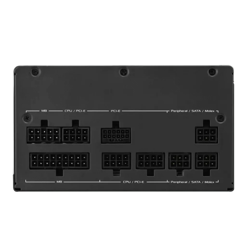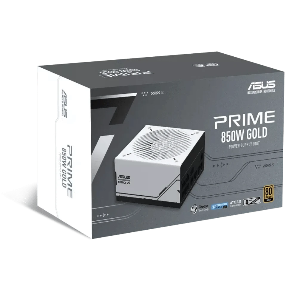 ASUS Prime 850W Gold ( AP-850G ). Total power: 850 W, AC input voltage: 100 - 240 V, Combined power (+3.3V): 110 W. Motherboard power connector: 20+4 pin ATX, Motherboard power cable length: 61 cm, SATA power cable length: 120,400 mm. Purpose: PC, Power supply unit (PSU) form factor: ATX, 80 PLUS certification: 80 PLUS Gold. Product colour: Black, White, Cooling type: Active, Number of fans: 1 fan(s). Cables included: AC, CPU, PCIe, Peripheral (Molex), SATA