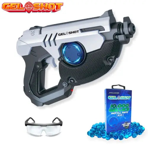| Box Contents | Gel Shot blaster, safety glasses, rechargeable battery, USB cable, hopper, 5000 Gellies refill, instruction manual |