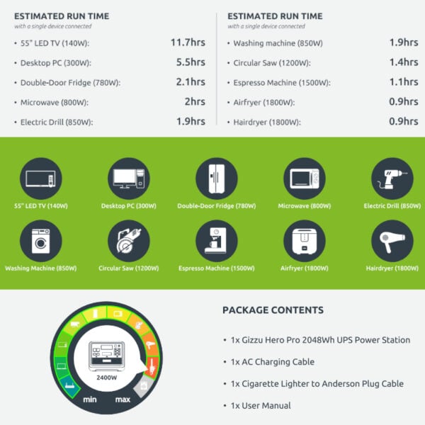 Stay prepared for any power outage or outdoor adventure with the Gizzu Hero Pro 2048Wh UPS Power Station. This high-capacity power solution is designed to provide reliable backup power for your essential devices, ensuring you remain connected and operational when it matters most. With a robust 2048Wh capacity, it’s perfect for home use, camping trips, or emergency situations.
