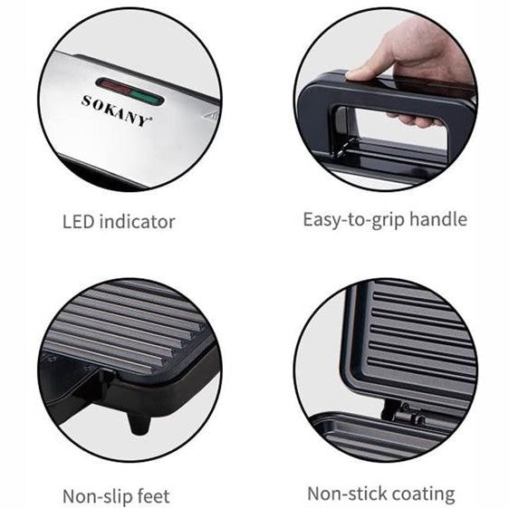 Sokany Multifunctional Grill Maker- Non-Stick Coating Cooking Surface Plates, 1000w Rated Power, Double Sided Heating and Cooking, Cool Touch Handle, Automatic Temperature Control, Easy To Clean, Colour Silver and Black Retail Box 1 year warranty
