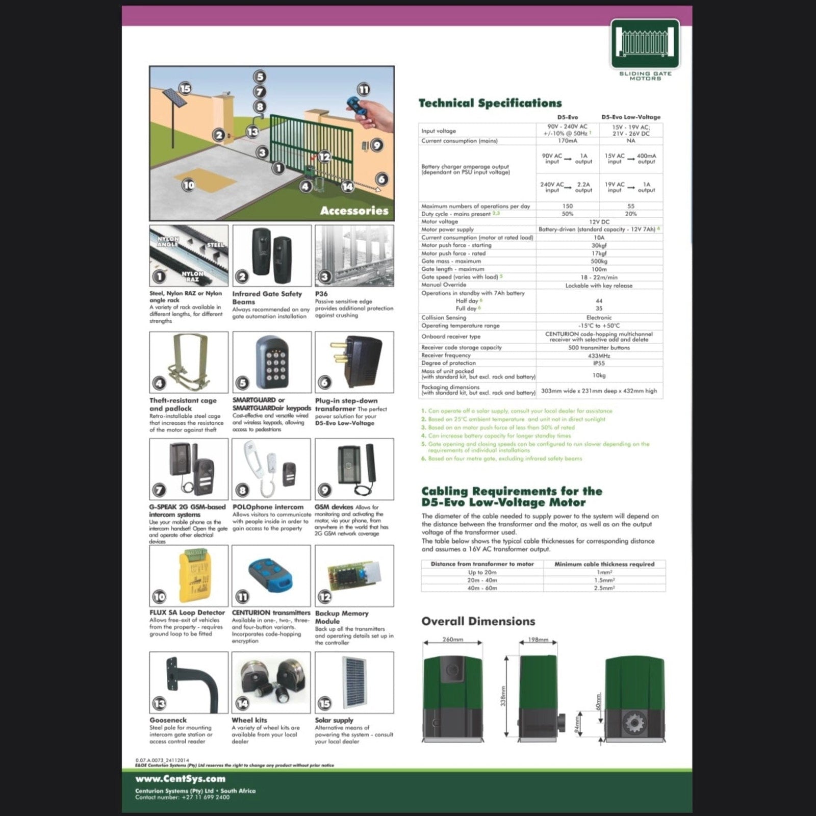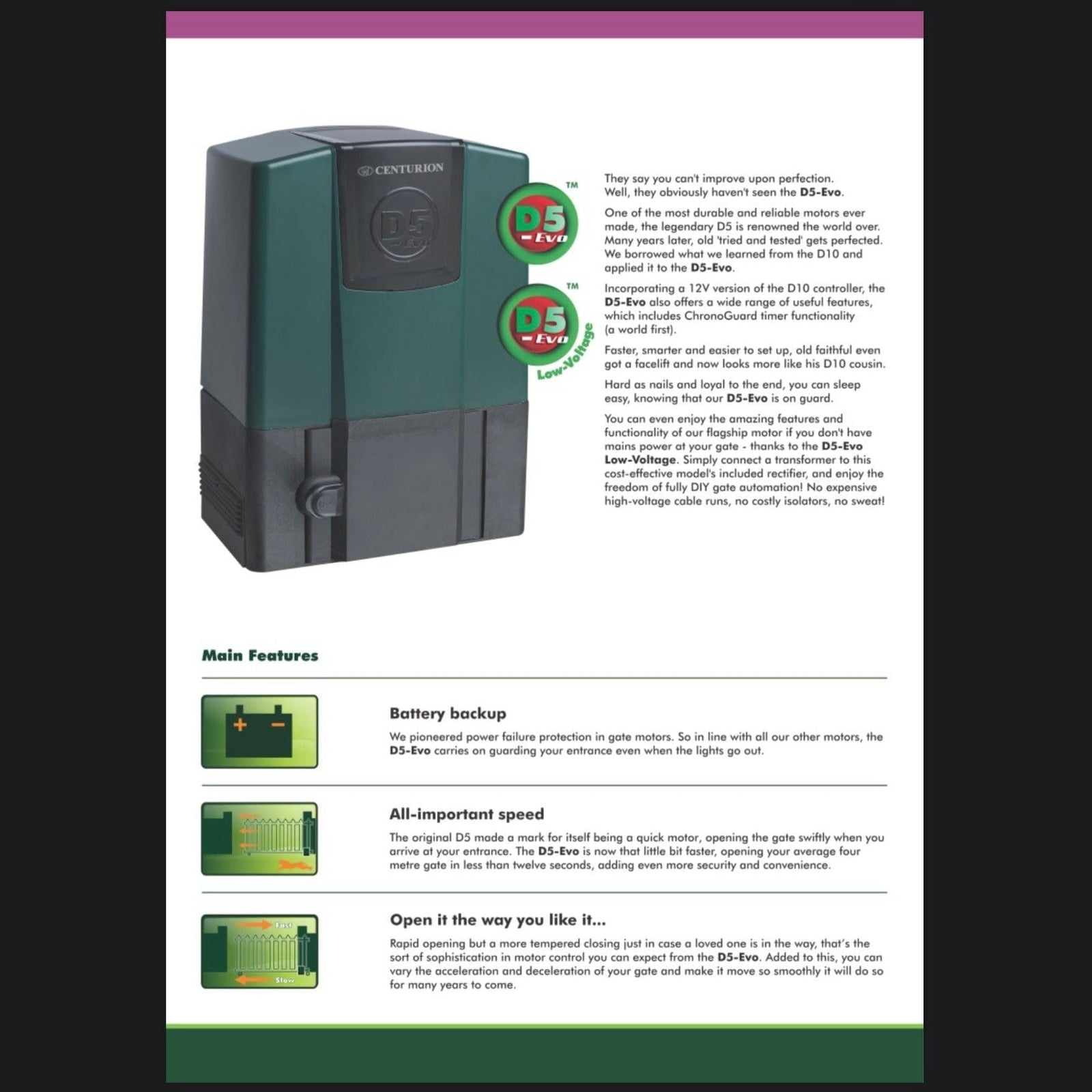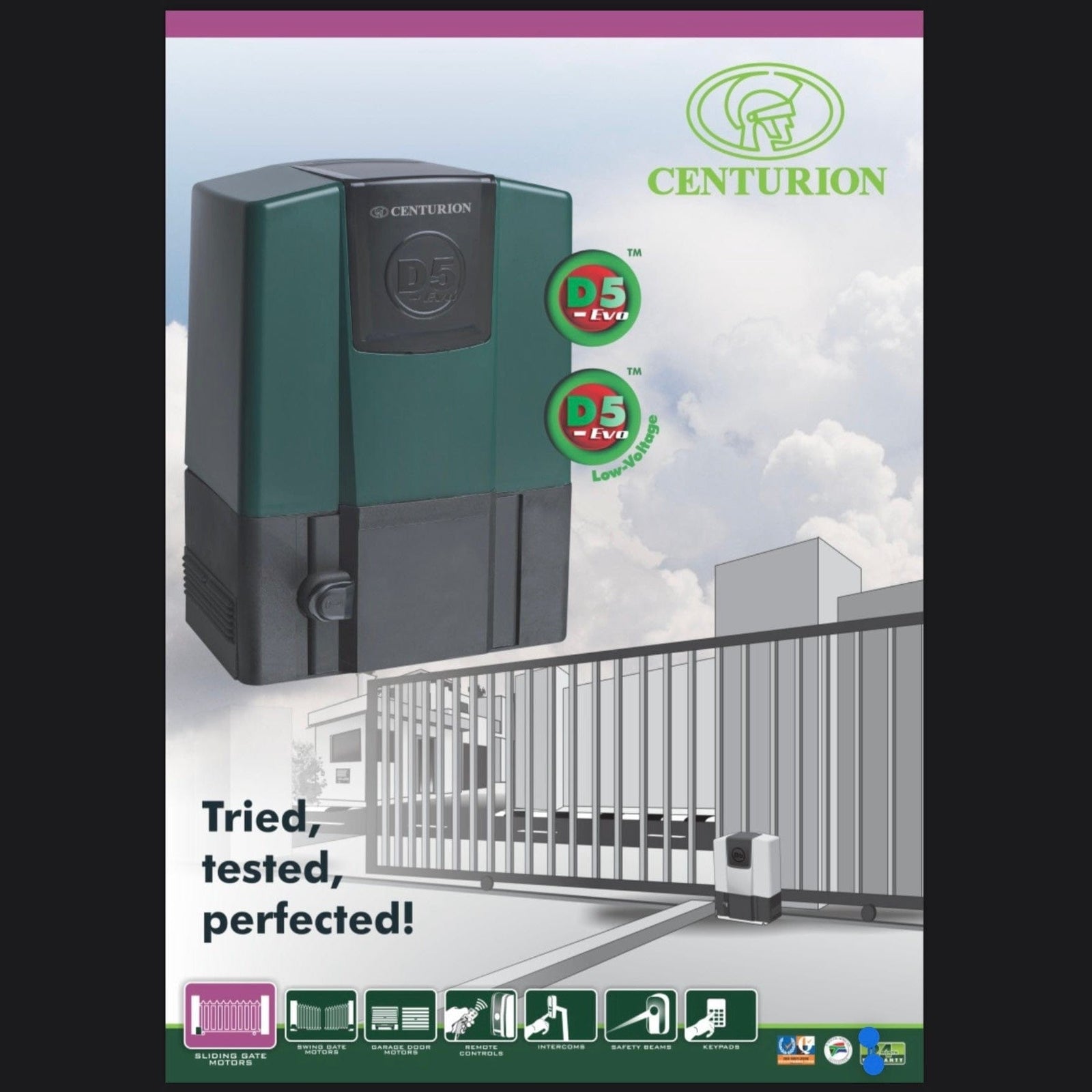 Elevate your property's security and convenience with the Centurion Sliding Gate Motor D5 EVO 12V (500kg). Designed for residential and light commercial use, this robust sliding gate motor offers a powerful solution for gates weighing up to 500kg. With its advanced technology and reliable performance, the D5 EVO ensures smooth and efficient operation, making it the perfect choice for those seeking both safety and ease of access. 🏡🔒