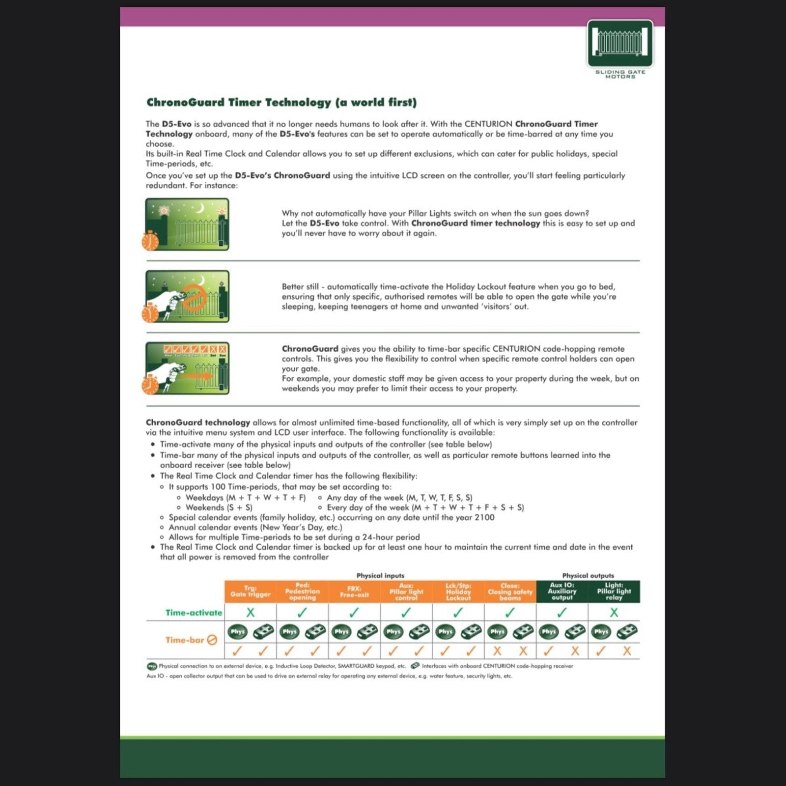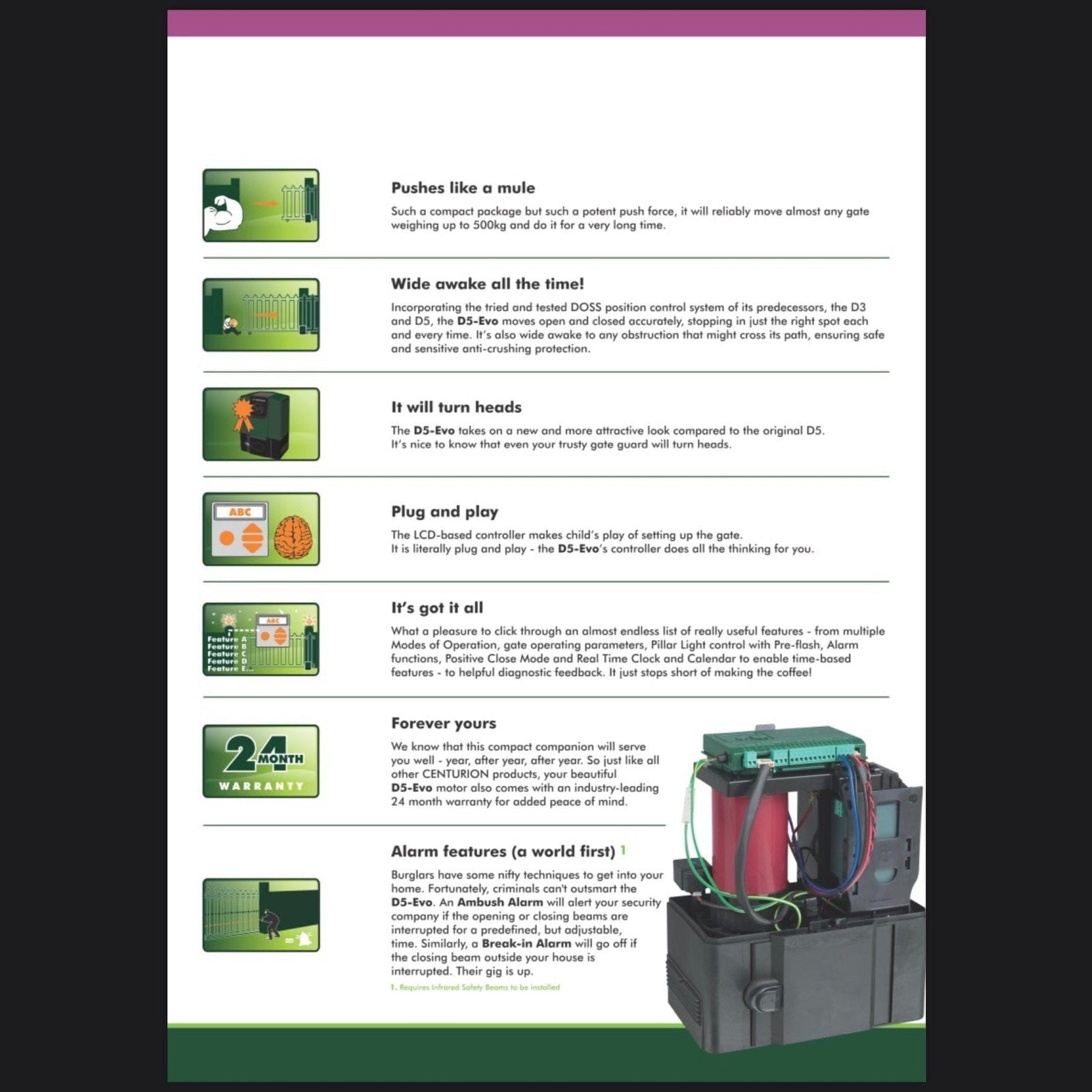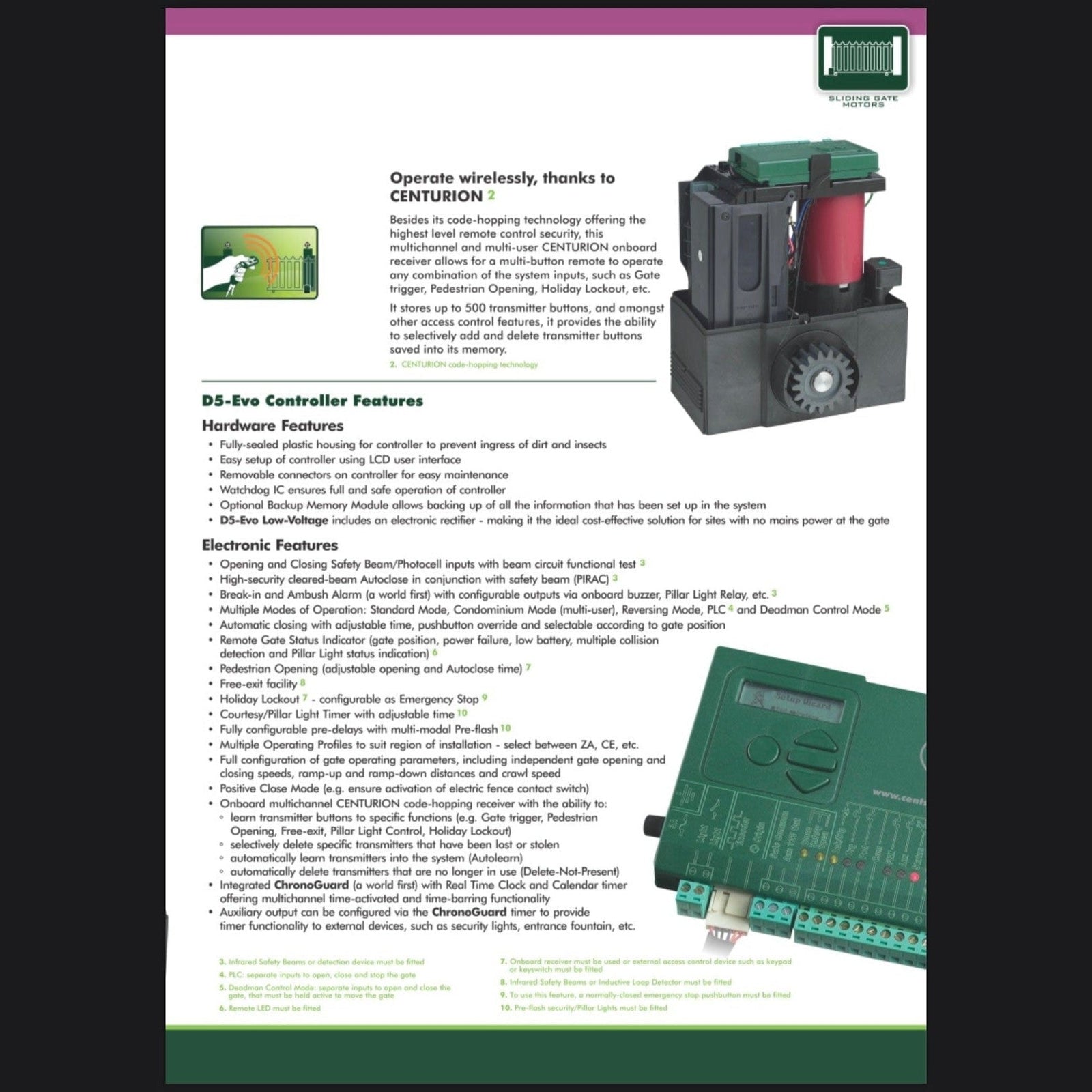 The D5 EVO features a user-friendly interface and a range of smart functionalities, including obstacle detection and soft start/stop features, which enhance safety and prolong the lifespan of your gate. Its compact design allows for easy installation, while the weather-resistant casing ensures durability in various environmental conditions. With the Centurion D5 EVO, you can enjoy peace of mind knowing your property is secure and accessible at all times. 🌧️⚙️