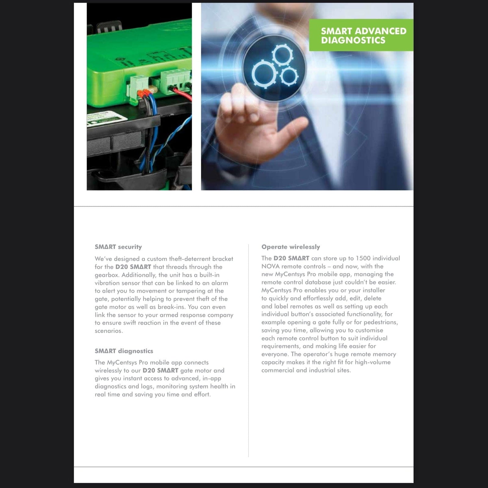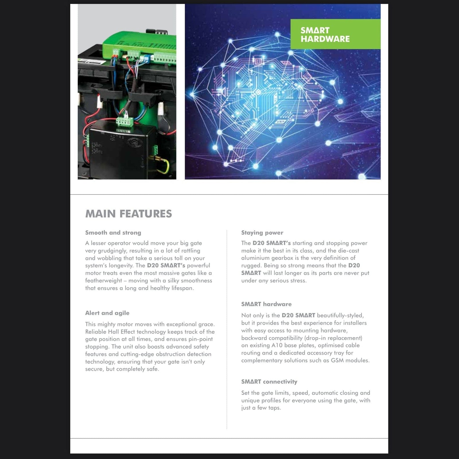 The 24VDC motor provides efficient and smooth operation, while the smart connectivity feature allows for remote access and monitoring via mobile apps. The included galvanized steel rack is engineered for longevity and resistance to corrosion, ensuring that your gate operates smoothly for years to come. With advanced safety features such as obstacle detection, auto-reverse functionality, and a battery backup system, the D20 Smart motor prioritizes safety and reliability in all conditions.