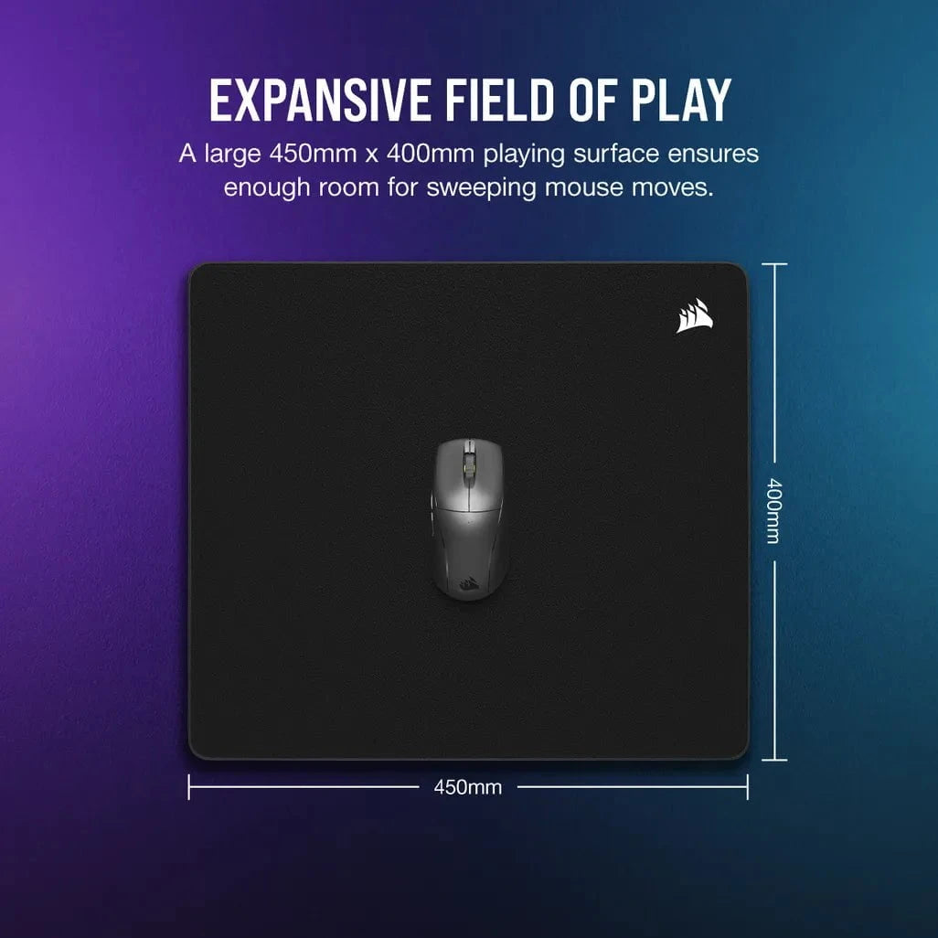 Corsair MM500 v2. Width: 450 mm, Depth: 400 mm. Product colour: Black, Surface coloration: Monochromatic, Material: Rubber, Woven fabric, Stitched edges, Non-slip base, Gaming mouse pad
