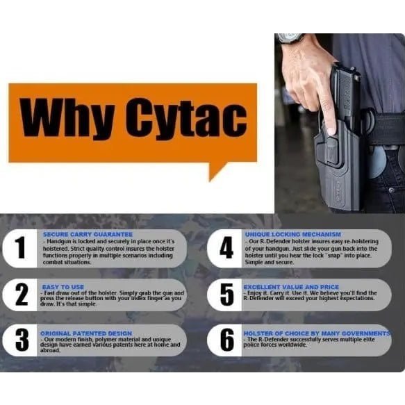 Constructed with military-grade polymer, this holster offers superior durability, weather resistance, and ease of maintenance. The paddle attachment allows for 360-degree rotation, letting you wear the holster in any position for maximum comfort. Its lightweight design, along with the ability to fit duty belts and web belts, makes this holster versatile and ready for a variety of situations, from daily concealed carry to law enforcement duties. CYTAC's R-DEFENDER OWB Holster is built to withstand extreme conditions, making it a perfect solution for both civilian and off-duty officers looking for a reliable, secure, and convenient holster.