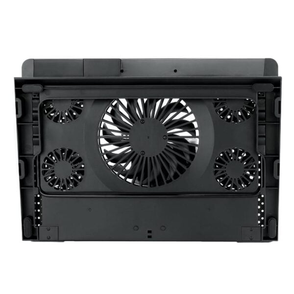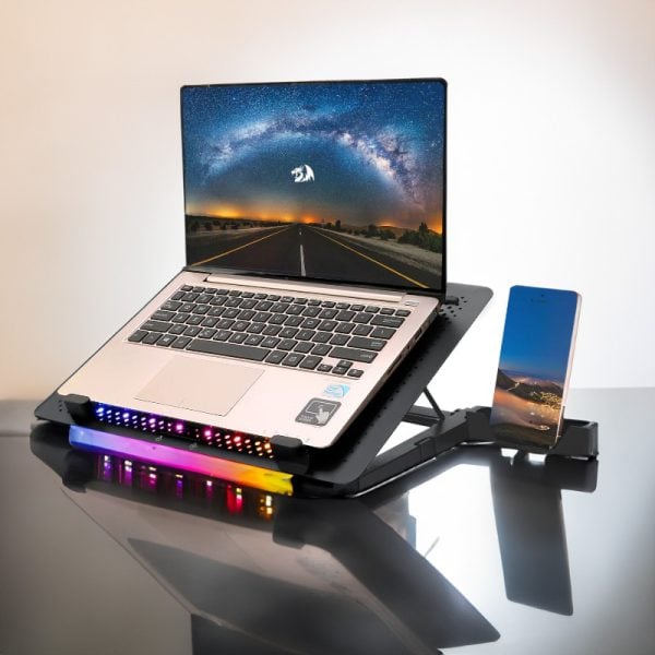 The Redragon GCP500 RGB Gaming Laptop Cooling Stand is a great way to keep your laptop cool. Whether working or gaming, the built-in 5 fan system ensures your laptops temperatures stay low when you need it most. Featuring 1 main fan with 4 smaller ones surrounding the main one, these quiet fans ensure you don't get distracted by the noise during usage. The unique design also features an adjustable stand to get the perfect angle for your needs. To add some flair to that design it also comes with a colourful RGB backlight. The stand also comes with 2 USB ports for connecting to your laptop for power and is designed to work with 12-16" laptops.