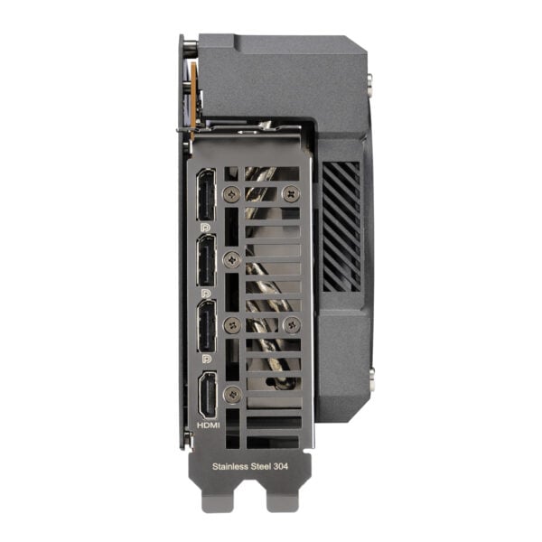 To keep temperatures in check, ASUS has equipped this GPU with an enhanced thermal solution, featuring MaxContact technology, a phase-change GPU thermal pad, and triple Axial-tech fans. The heatsink’s expanded surface area improves heat dissipation, while dual-ball bearing fans propel 31% more air than standard designs. The two outer fans spin counterclockwise to minimize turbulence and maximize airflow, stopping entirely when temperatures drop below 55°C for silent operation during light tasks.